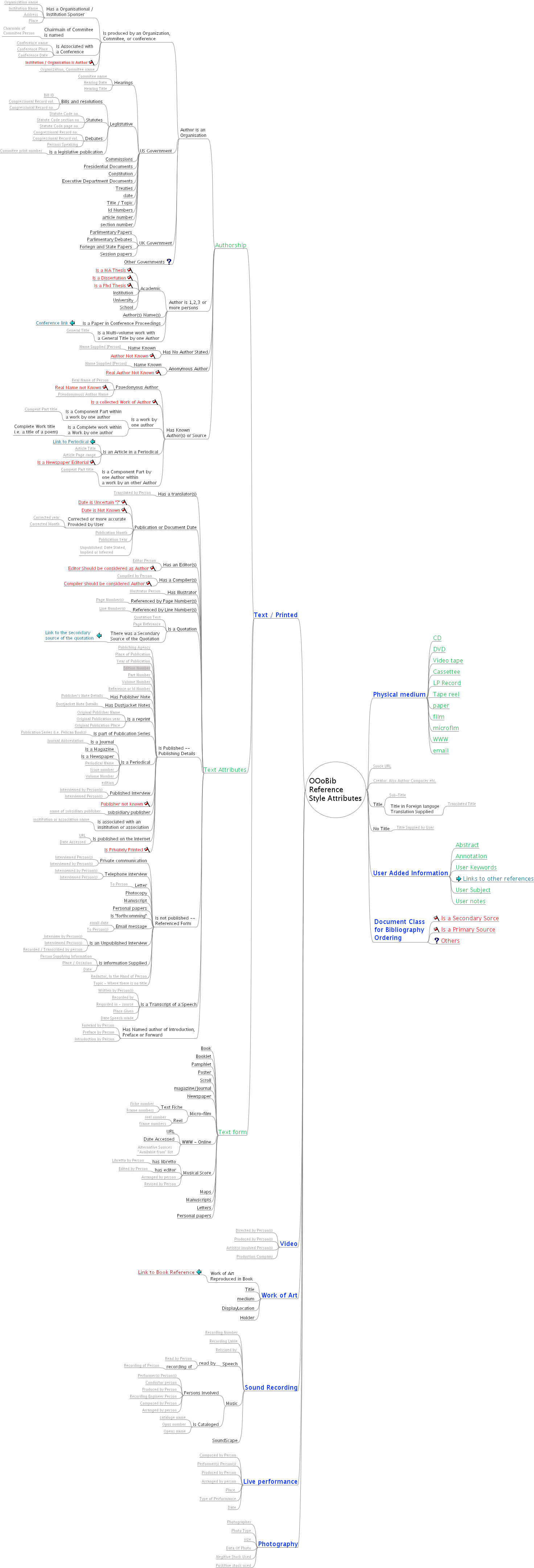 Following on from the ideas discussed about a new approach to the OOoBib user interface. I have started a new analysis of the decision structure and attributes of a bibliographic system. However, not starting from library catalogue data as is usually done but from the Style Guide of the type the user might be attempting to implement / use. I extracted the information and descision points that the Style Guide considered important. I am using a mindmap program called freemind (the developent version 0.8.0 RC3) to collect and organise the data. (It is a java program so should run on most systems) A high level graphic diagram of my first effort is shown bwlow. This provide some interesting insights and starts to suggest some user interface options
