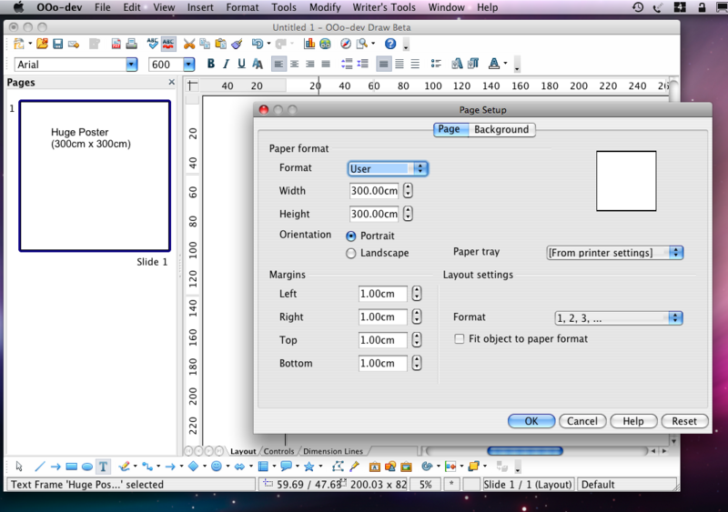 Maximum Page Size Enlarged for Draw (300cm x 300cm)OpenOffice.org Draw allows the create of very large documents of up to 300cm by 300cm. Thus; OpenOffice.org Draw is a powerful tool for things like scientific posters, etc. |