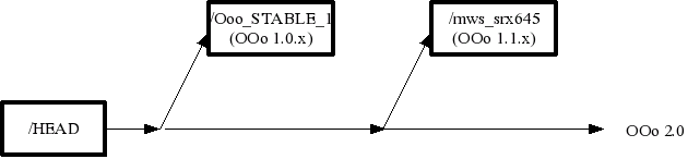 In the OpenOffice.org environment these branches are often called codelines or master(-branches). Builds on these codelines does not happen continuously (daily builds) but within regular milestones. For the 1.1.x codeline this result in a cvs branch tag called mws_srx645 which represents the latest status of this codeline and several more tags which represent a specific milestone on this codeline (SRX645_m34, SRX645_m40). The same scheme applies to the 2.0 codeline (mws_src680 for the latest status, SRC680_m36 for a specific milestone). Usually every week there will be a new milestone on the active development line available. There is also the possibility to achieve some more granularity with the introduction of steps, so that more than one build per week is possible (SRC680_m33s1).